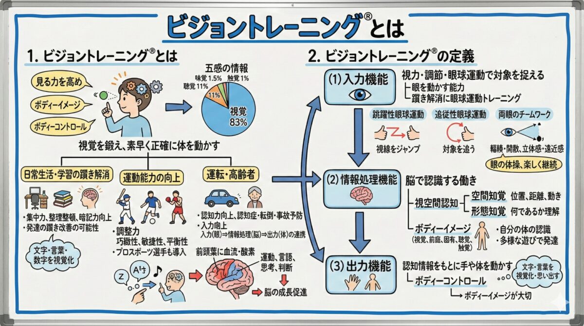 ビジョントレーニング®とは、見る力を高め、見たものや自分の体の動きを正しく認識したり(ボディーイメージ)、体を自分のイメージ通りに動かしたりする(ボディーコントロール)機能を高めるトレーニングです。五感の情報は視覚83%、次いで聴覚が11%で、残りの嗅覚3.5%、味覚1.5%、触覚1%だと言われている様に、視覚から受け取る情報が一番多く、視覚を鍛え素早く正確に体を動かせるようになることが、日常生活や学習の躓きの解消・暗記力の向上・運動能力を向上・車などの運転中の認知力の向上・高齢者の認知症予防などに役立ったりすることも、多数報告されています。また加藤(2009)によると、ビジョントレーニング®を行うと前頭葉の内側の広い部分に血流と酸素が集まり、また第一次視覚野が位置する後頭葉以外の脳の成長を促す効果もあると報告されています。前頭葉は人間の運動、言語、思考、判断を司る場所であるので、ビジョントレーニング®をすることでそれらの能力の発達を促すことが期待できます。